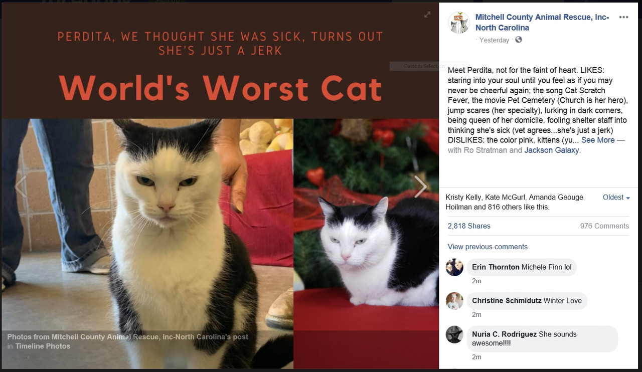 Mitchell County Animal Rescue tells prospective owners exactly what to expect from domestic short-hair mix Perdita in a Facebook listing that is going viral.