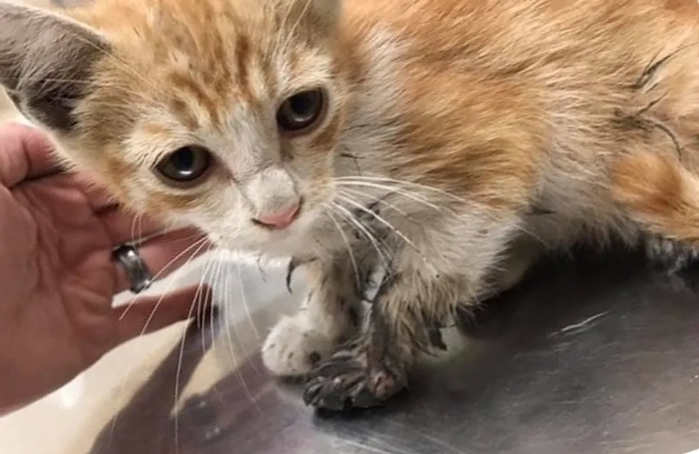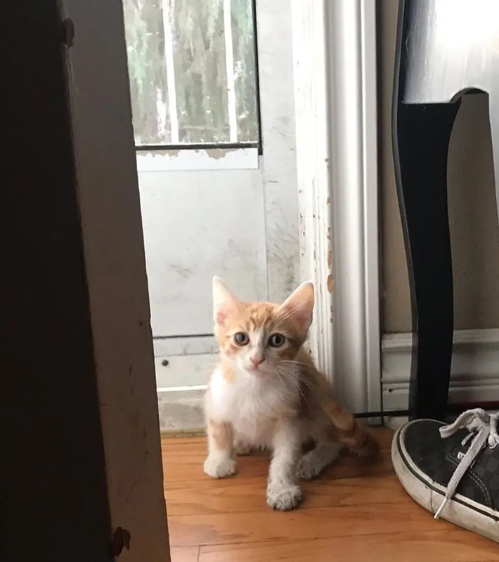 A scrawny little kitten wandered his way to a woodshop in Long Beach, California, meowing nonstop for attention.