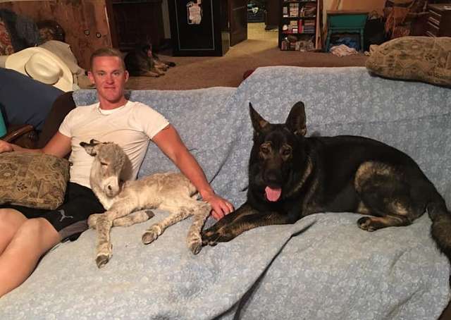 Growing up with three German shepherd siblings, the little donkey has picked up quite a few unusual habits. But his parents love him just the way he is.