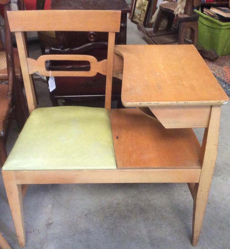 A telephone table has a seat. My grandmother had one, and I owned it for a while and then gave to my sister, not too long before her house burned down and she lost everything. Here's an example of one almost exactly the same as mine, but I'm having no luck this am with posting the actual pic: