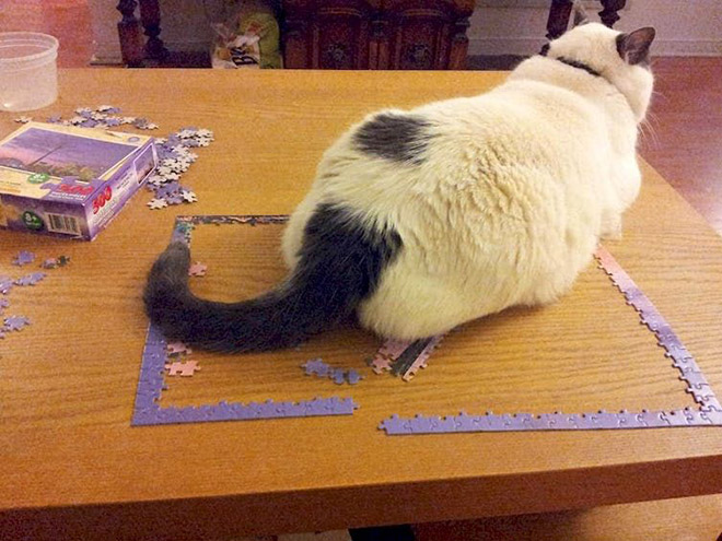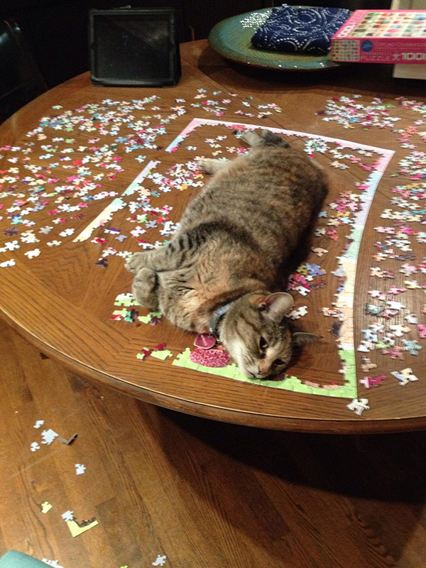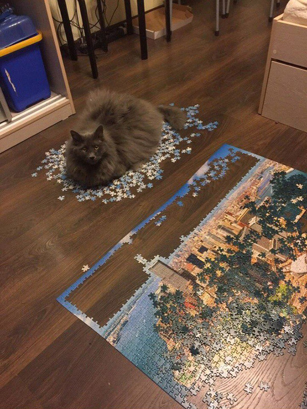 (26,984 posts)Took me 5 months was 3/4 finished. Always covered it with a box when I left my house. One day running late I forgot to cover it. Came home and All the pieces were on the floor and my cat was lying on the pieces and playing with them.