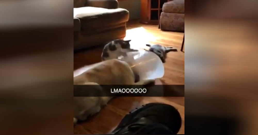 So we had to put a cone on my dog again. My cat loves it, Klutch wrote as a caption to the eight-second video he uploaded one evening. The video is incredibly short yet undeniably hilarious; it shows a big yellow lab sprawled out on the living room floor as his family watches television. The dog is indeed wearing a large plastic cone, and the cat is clearly very curious because hes kneading the hard plastic cone like hes a champion biscuit-maker about to go pro.