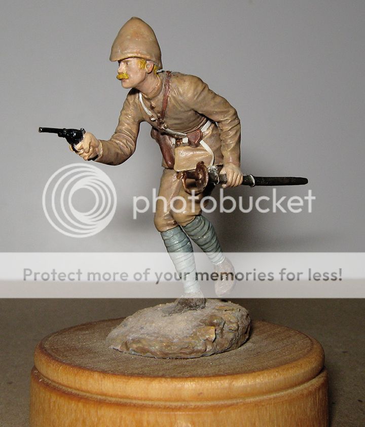 This is an English subaltern of the Second Afghan War, a 54mm figure sold by Art Girona as being one of the 66th Foot at Maiwand, where the regiment was cut to pieces in one of the classic defeats England took at times on the Northwest Frontier. It was the closest I could come nowadays to matching an old figure I remembered having done when young, that on a whim I went hunting one night through the inter-tubes to see if I could track one down.
