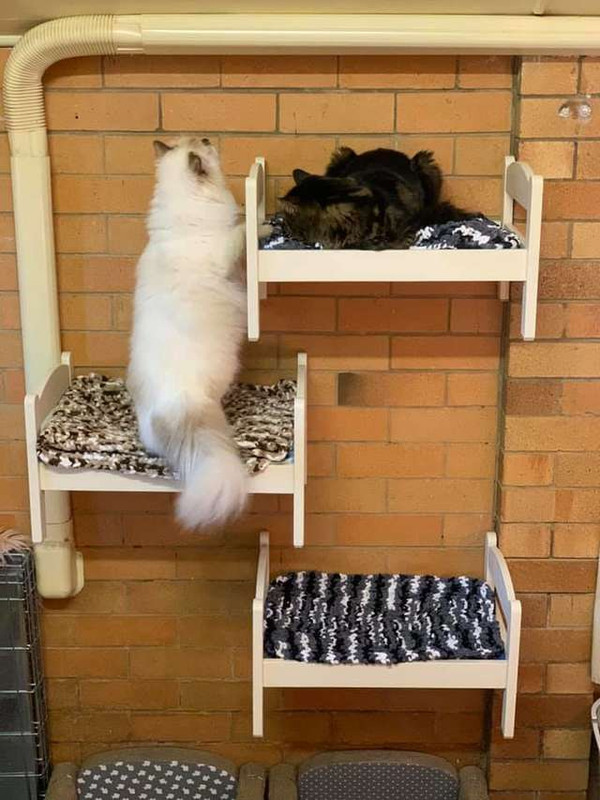 She couldnt find enough separate places for the beds, though, so finally she decided to mount the beds to the wall, giving each cat their own unique space