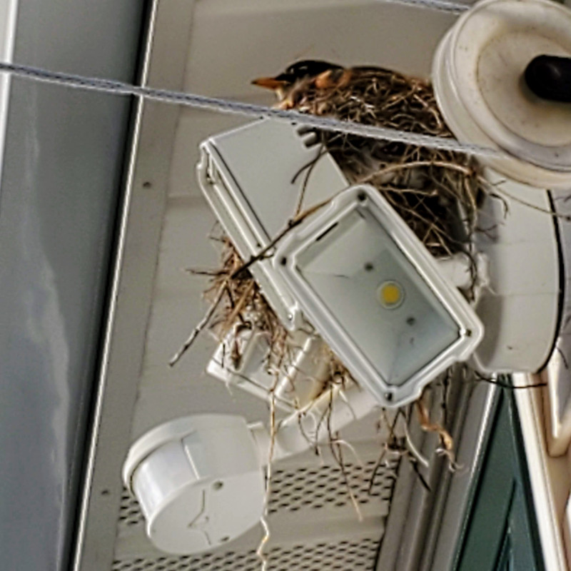 A robin built a nest on the light several weeks ago.