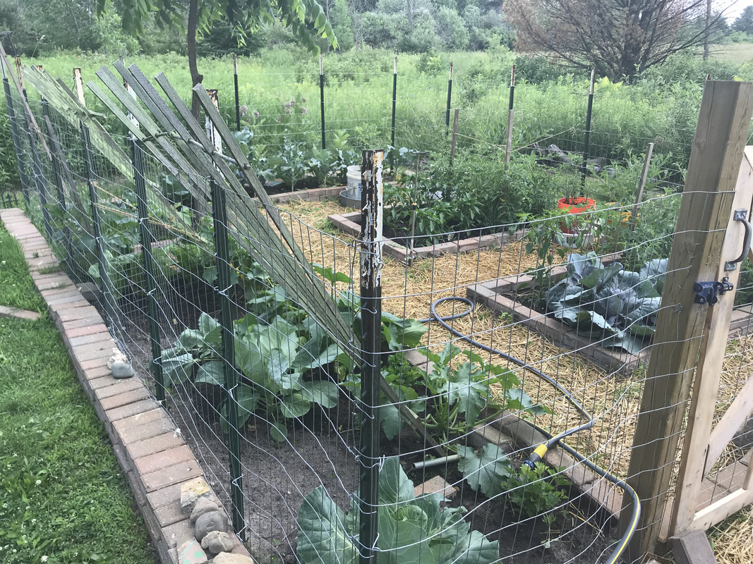 The side bed going toward the gate cabbage, green beans watermelon, Delicata Squash, romaine lettuce, cucumber, zucchini. Milkweed is growing, spreading and being treated very well. Its peeking up on the other side of the fence.