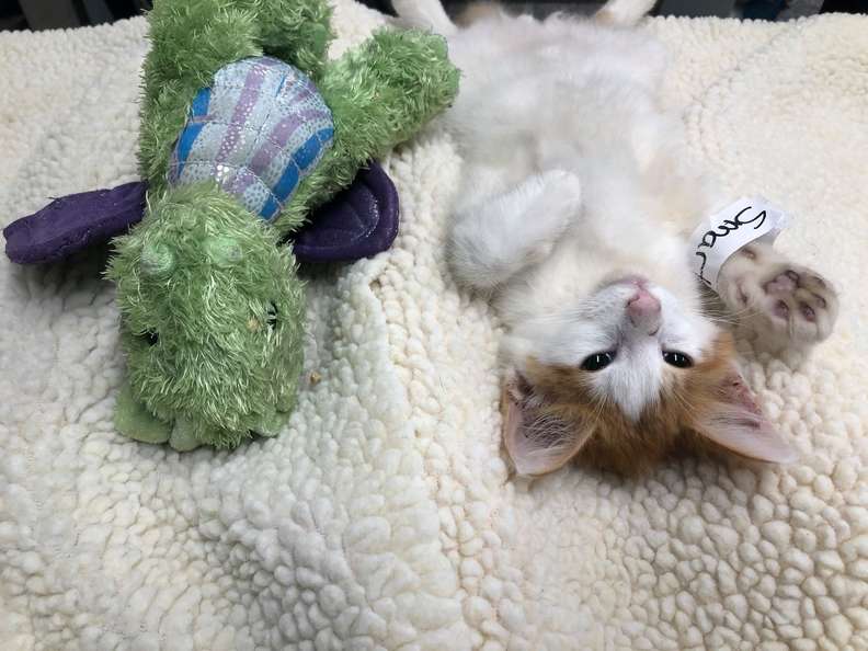 Ponyo went to Operation Catnip, a spay-neuter organization that focuses mainly on unowned, free-roaming community cats, to get neutered. As soon as he arrived, everyone there fell in love with the tiny kitten hiding behind his beloved stuffed dragon for comfort.