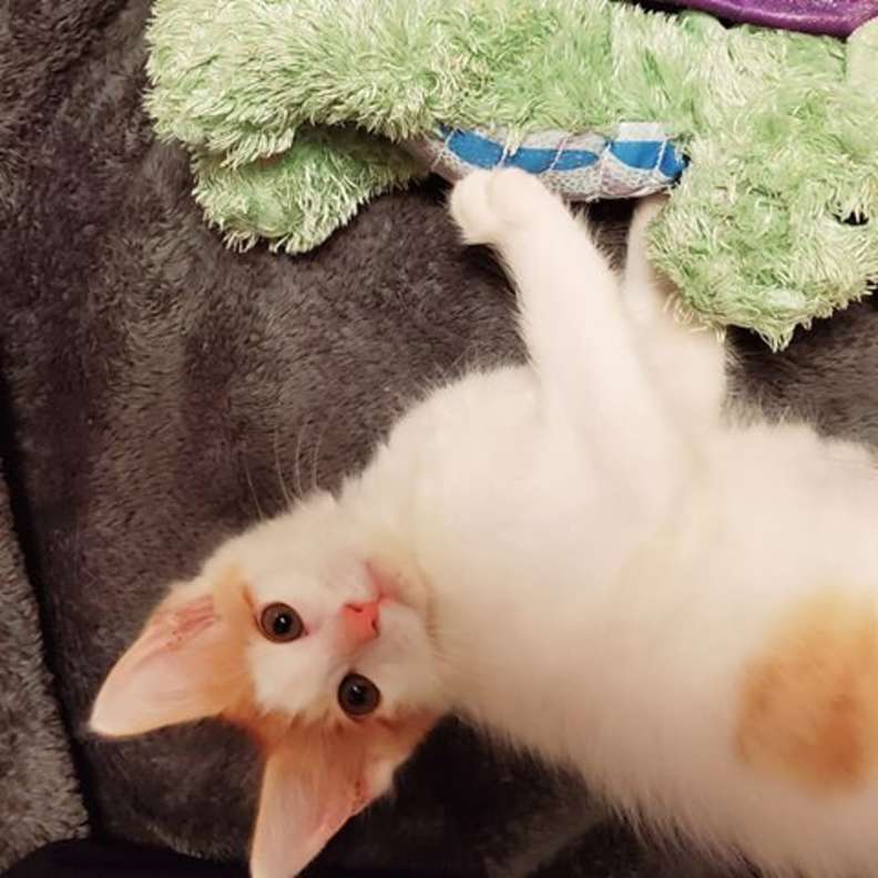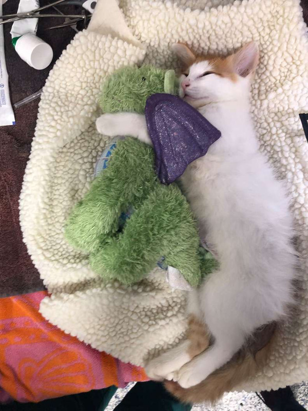 When Ponyo arrived at the clinic, he was very nervous, Melissa Jenkins of Operation Catnip told The Dodo. We all noticed his sweet dragon friend in the carrier with him, so we put the dragon in the kennel with him. Ponyo hid behind the dragon at first and clearly took comfort in it.