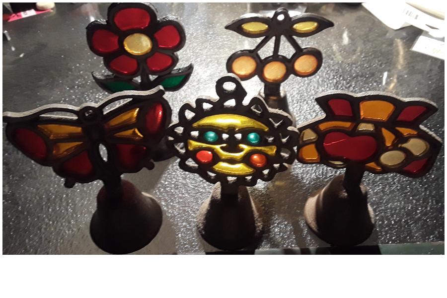 Plus, the colorful ones like the Tiffany lampshade, I found over different years in different places, but clearly they were made in the same place with the stained glass motif. They don't have any markings at all.