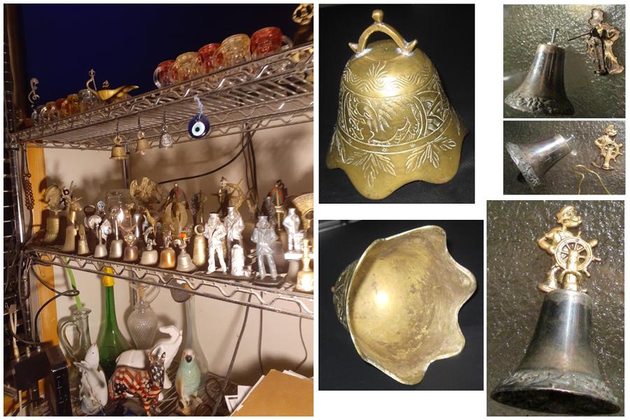 ******** So nostalgia grows fonder ever the further back in time it reaches, and a decade after my 4 yrs stint in the Navy I started to get misty about it forgetting how I counted the days while in it. Details here and there looking better. One was about the Ship's Bell, especially on my smaller first ship where it was more prominent, and then at a flea market or second hand antique store, there was a small brass bell with a figure or animal of some kind as a handle, and that started the collection mania going. And going and going. And a few people would bring me one from their tours. I like only brass or other metal ones, and I graciously accepted glass and China ones until the benefactors departed when I would re-gift those.