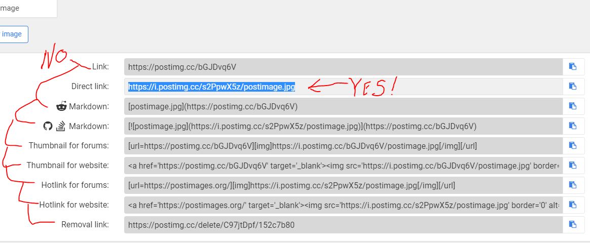 then find the image file you saved and upload it. Postimage will present you with a list of options and all you have to do is select "Direct Link" and copy that link