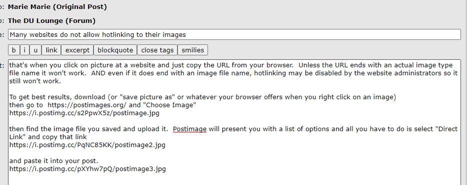 (12,132 posts)that's when you click on picture at a website and just copy the URL from your browser. Unless the URL ends with an actual image type file name it won't work. AND even if it does end with an image file name, hotlinking may be disabled by the website administrators so it still won't work.