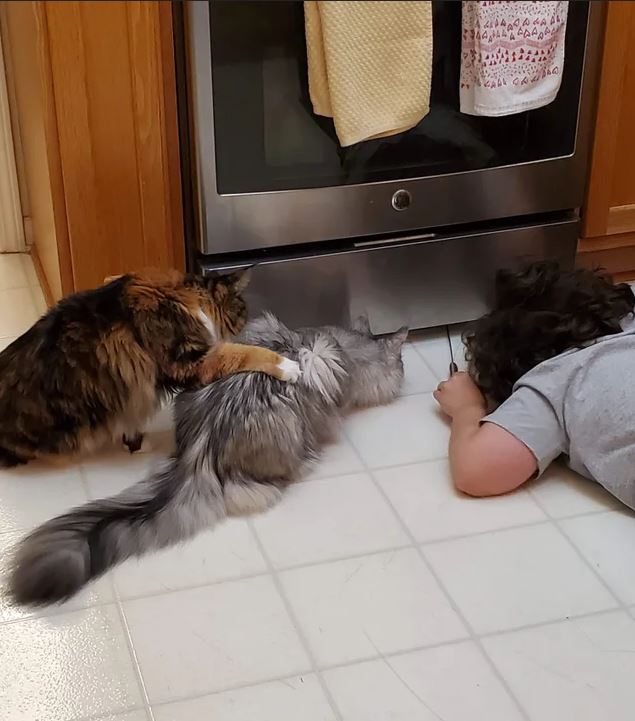 Cat comforting her pal as human digs under the stove for lost toy (Original Post)