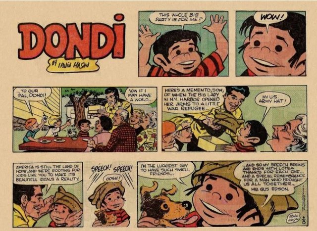 Dondi is a daily comic strip about a large-eyed war orphan of the same name. Created by Gus Edson and Irwin Hasen, it ran in more than 100 newspapers for ...