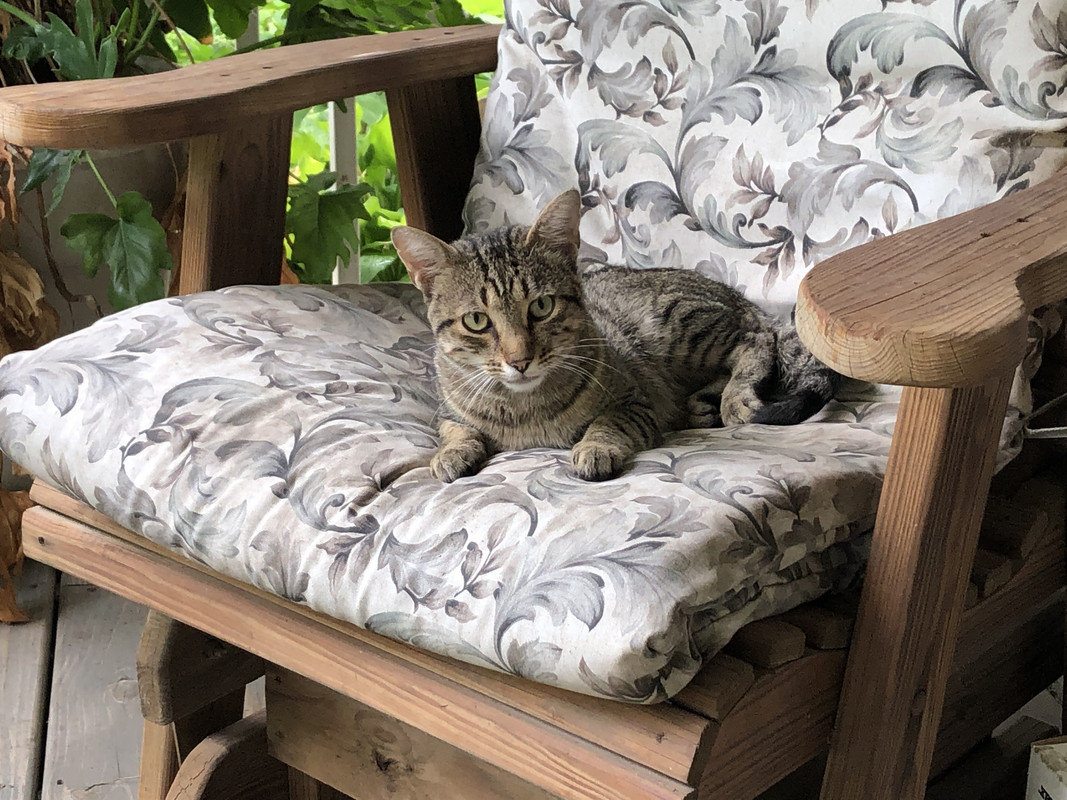 This is the porch chair where Mr. Cat often sleeps, or at least where I usually find him in the morning, especially in bad weather. It rained last night and this morning, so there he was, waiting for his breakfast of Fancy Feast.