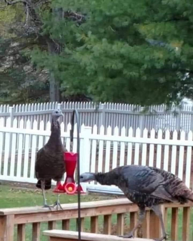 (733 posts)I saw two turkeys in a freshly cut hay field today. I've never seen them at a feeder, especially not one for hummingbirds.