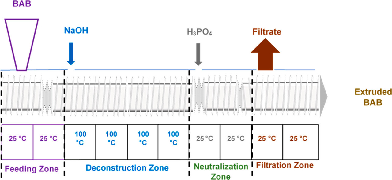 Our extended group evaluated different feedstocks, such as corn stover, switch grass, palm tree, and BAB, among others, to produce bioethanol and other added-value molecules, using a combination of mechanical and chemical pretreatments. This resulted in the so-called combined extrusion saccharification (CES) process, which includes the combination of alkaline and enzymatic hydrolyses conducted in a modular twin screw extruder (TSE) in a type of reactive extrusion process (REX).(21−25)