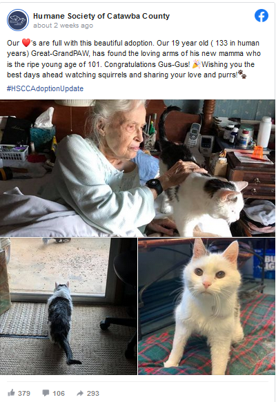 Meanwhile, a 19-year-old cat named Gus was being surrendered to the same North Carolina shelter as his owners work commitments changed.