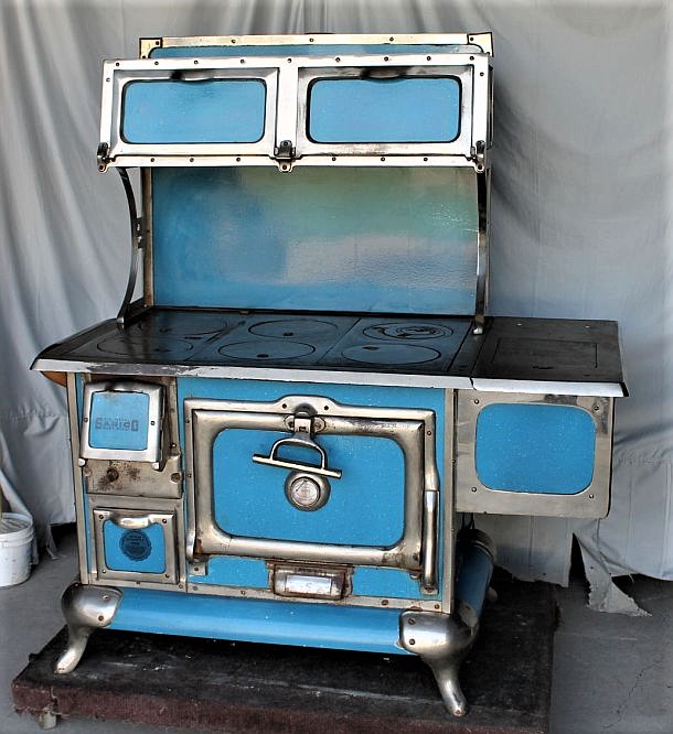 "This is an old antique wood or coal burning porcelain range cook stove done in the attractive blue enamel. (Ours was white enamel) This stove is complete with the hot water reservoir on the right side and the oven in the bottom section, and two warming ovens above the stove. This stove was made by the Sanico American Range & Foundry Company. Measures 59 1/2″ high is 32″ deep and 55″ wide."