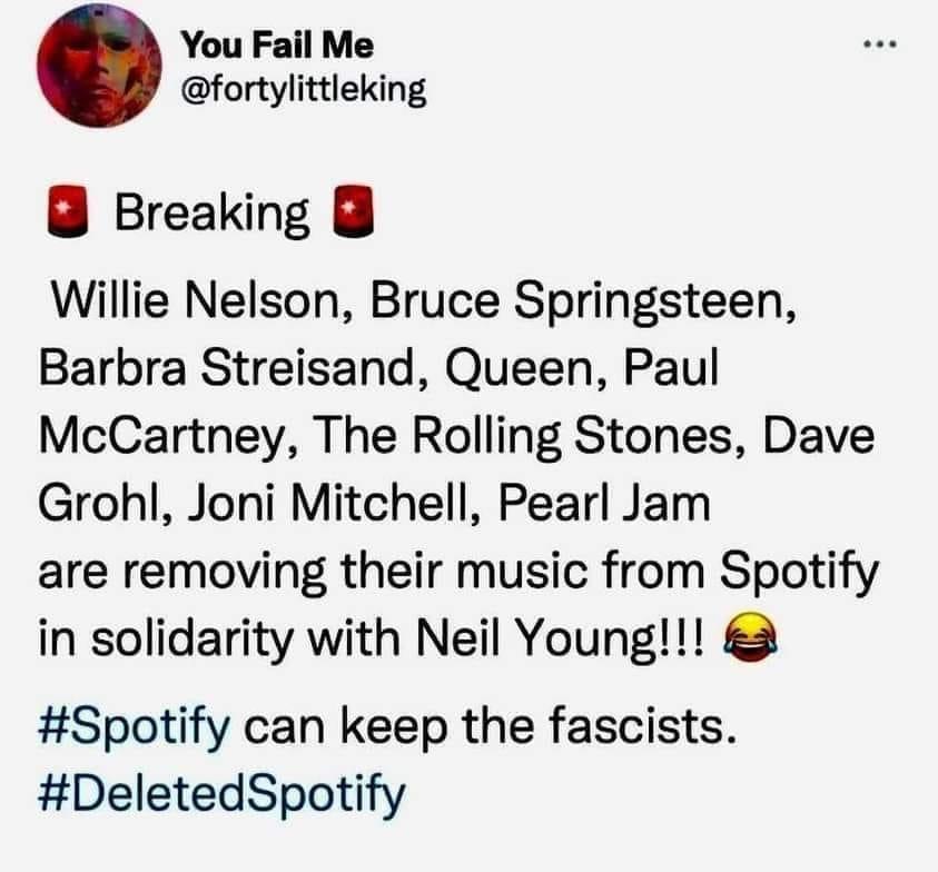 Bruce Springsteen, Barbra Streisand, Paul McCartney, The Rolling Stones, Dave Grohl, Joni Mitchell, Neil Young, Willie Nelson have removed their music from Spotify so that they can keep Rogan who has absolutely no talent. Great choice.