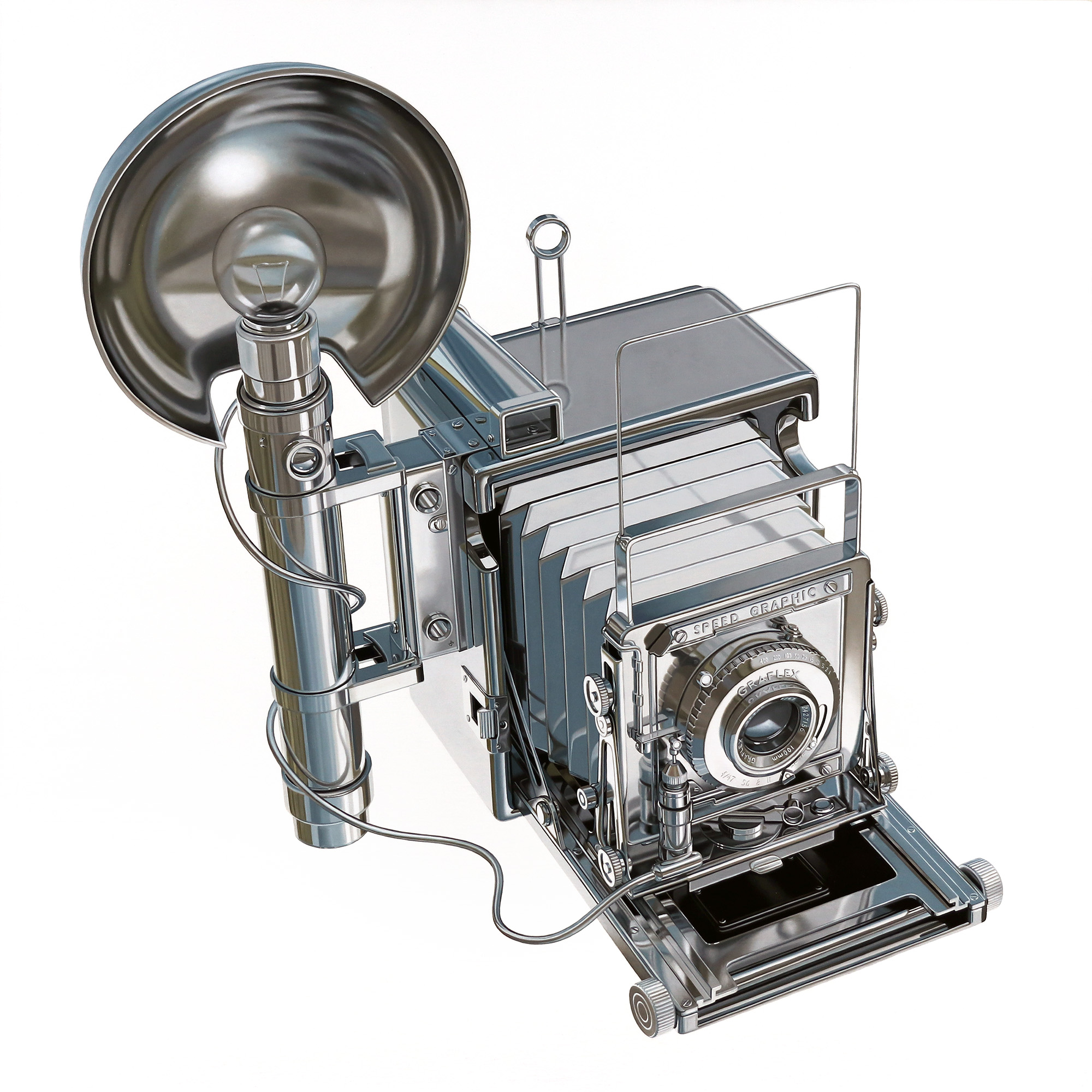 (3,782 posts)That first Speed Graphic is positively Uncanny Valley. The vertical loop of whatever at the bottom of the rails is supposed to be a pair, which you squeeze together to drag the lens holder out to its working position. Just a single one doesn't work. Also the rail board folds up to become the front of the camera when folded up, so it has to be the same size as the front of the camera. That's just how the machine works. The one in the illustration is way too short. It appears that his working source material was pictures of these cameras which he doesn't quite understand.