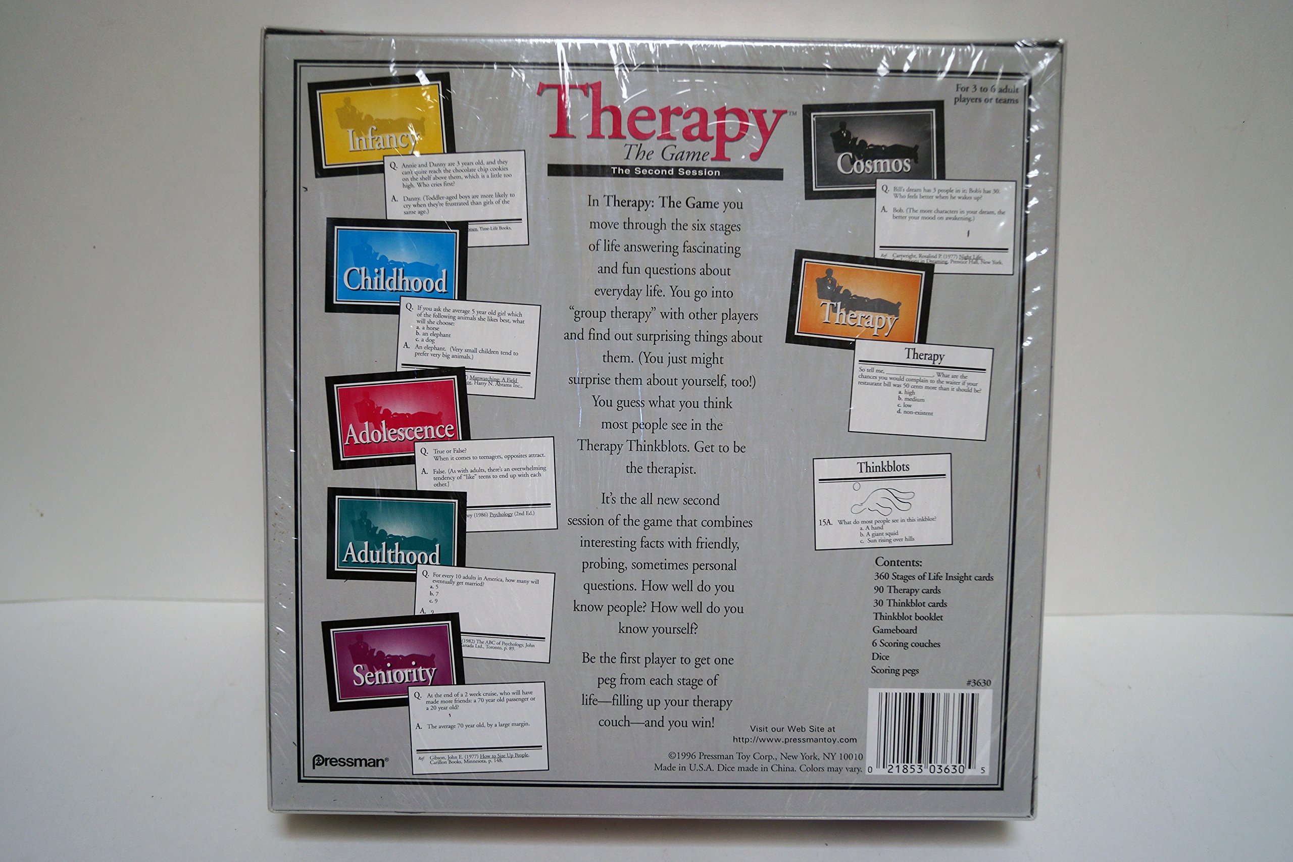 (32,803 posts)A party game combining luck, knowledge, and group therapy best describes Therapy: The Second Session. Strange but fun. The goal is to be the first player to move your token (shaped like a therapist's couch) across the finish line. You do so by rolling the dice, answering questions about each stage of life, and escaping "all-better" from therapy with another player. Can an opponent correctly guess your answer to a therapist's question? Can you correctly analyze the inkblots (answering what most people think when they see that blot)? What about your knowledge about the age at which women are most sentimental (age 60), combined with your ability to guess (declare) that your friend holds a grudge? The right answer could get you out of the shrink's office fast. Isn't that always the goal? In the process, you'll learn surprising facts about people in general and your friends in particular. --Richard Farr