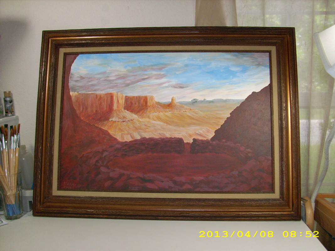 (3,581 posts)called "False Kiva". You can only get there by a long hike, so I painted it from photos because my hiking days are over LOL. Acrylics are the BEST! I've tried oils, but they really stink. I cannot stand the smell. Watercolors are very demanding. An "oops!" is there forever. If you make a mistake with acrylics, just let it dry and paint over it!
