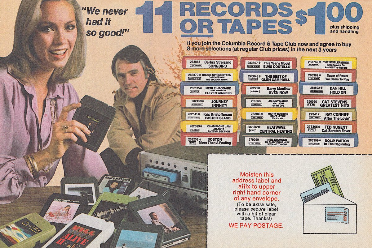 (22,460 posts)Although the BMG club was a much better deal- you got fewer (8 IIRC) records up front, but only had to buy 1 or 2 to fulfill your obligation, and you could buy 1 title for half price with your 8 free selections to fulfill your obligation.