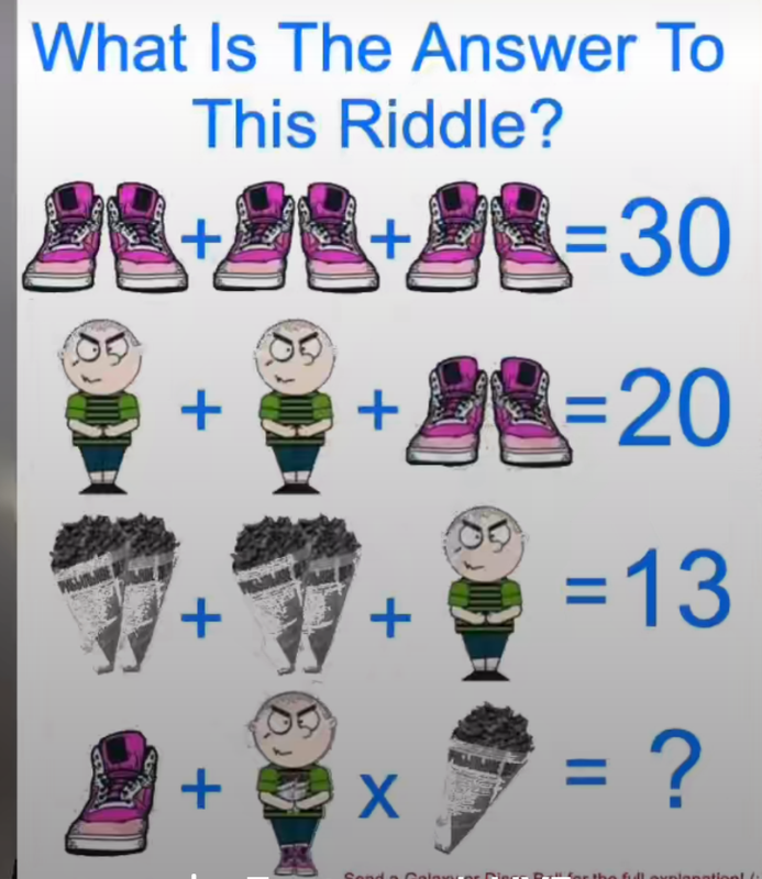 (6,160 posts)Each shoe is worth 5, as is the kid, equaling 10. Each ice cream cone is worth 2, which added to 10 makes 12.