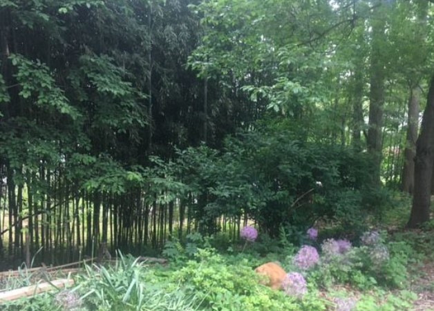 Well, this made a marvelous pied-à-terre for Oliver, as the surface on top the storage unit was clear and behind it was a clumping bamboo and a retaining wall.