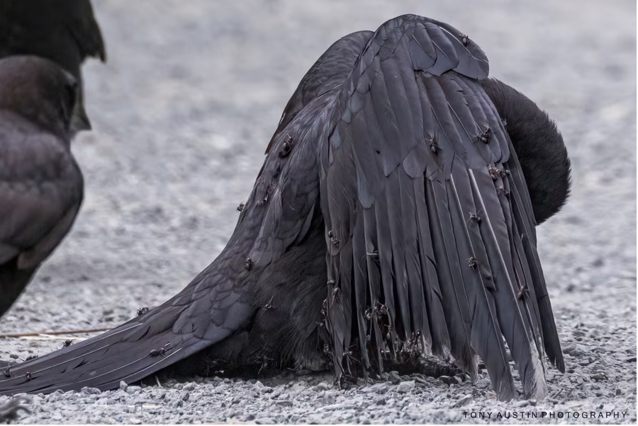 Photographer Tony Austin recently captured a peculiar image of a crow with its wings covered in dozens of tiny black ants in the throes of what appeared to be a behaviour he described as a "very odd and violent dirt bath."
