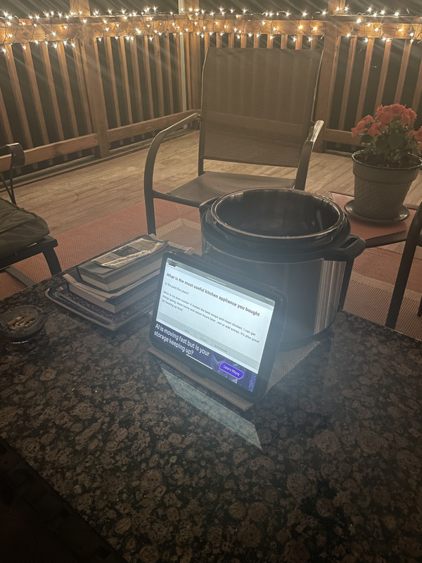 I needed a prop for my iPad one day, something heavy and tall enough to hold it, and grabbed the Instapot real quick for a Zoom meeting that was about to start. It's perfect! The pot holds all my pens and lighters and cords and random junk, so my table stays neat. I have a piece of rubber shelf liner as a no-skid mat underneath. Perfect! It lives out on the covered deck now and I use it every day.