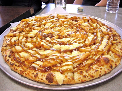 Pizza, topped with french fries, cheese curds and gravy.