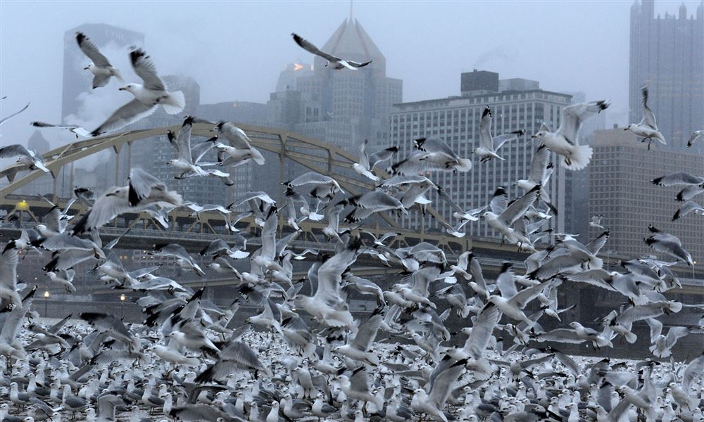 Seagulls take off from the North Shore during a light snow over the Pittsburgh skyline. The seagulls have relocated to the three rivers because of the freezing of the Great Lakes.