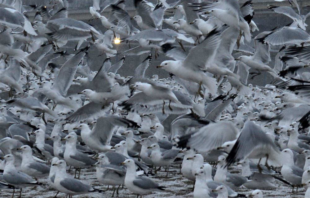 Seagulls take off from the North Shore during a light snow Wednesday.