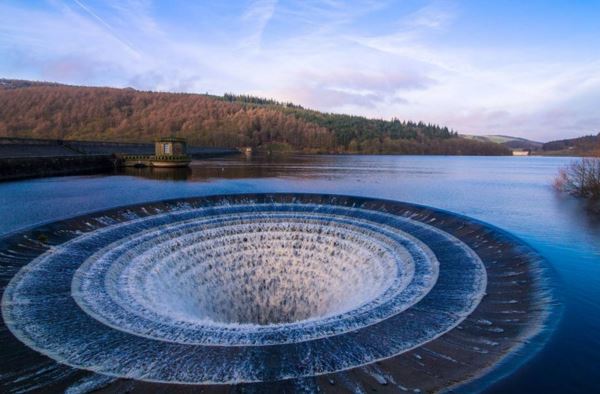 These stunning images show the overflow plug at picturesque Lady Bower Reservoir, in Derbyshire, in full-effect.