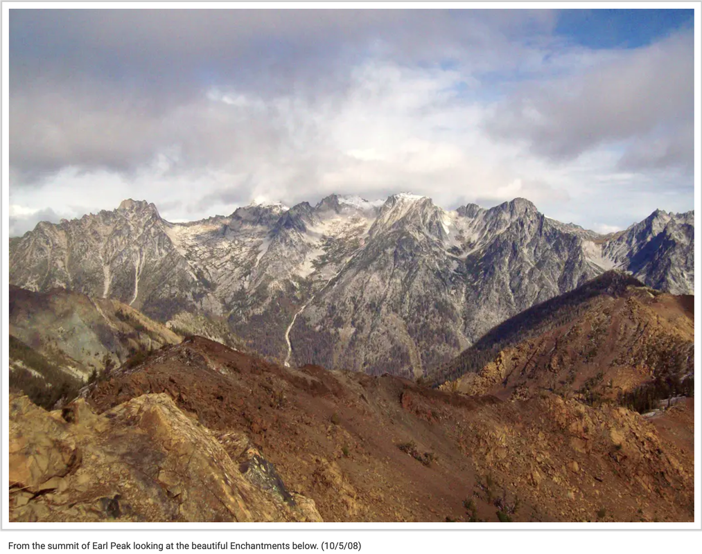 The page includes this photograph: "From the summit of Earl Peak looking at the beautiful Enchantments below. (10/5/08)"