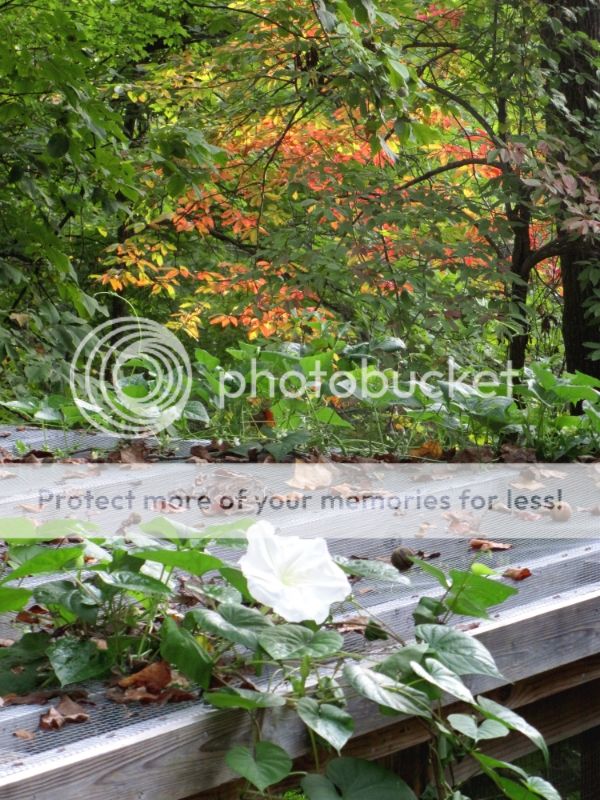 Moonflower is growing through the top of hubby's enclosed veggie garden--first fall color in the background.[URL=