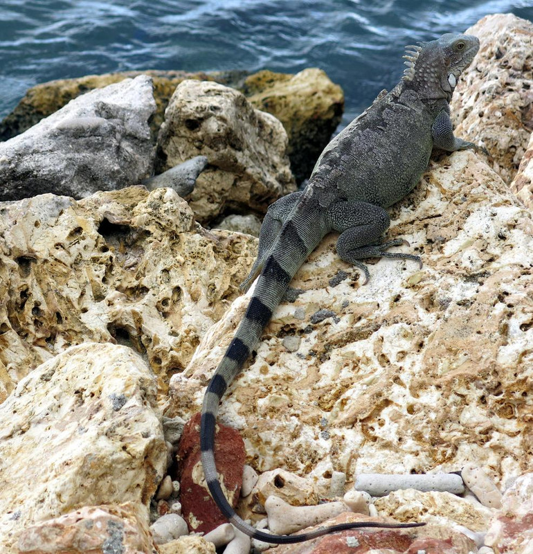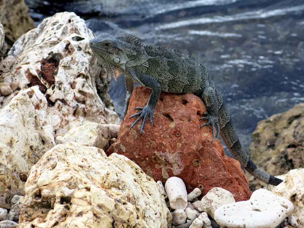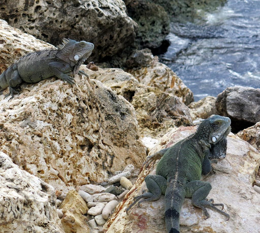 My room faces the channel entrance to the marina at the resort. There are rocks all along this side. The green iguanas that I found so fascinating last March when I was here seem to have become quite a colony. Here are a few shots from this morning.