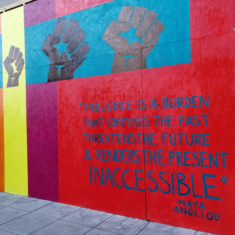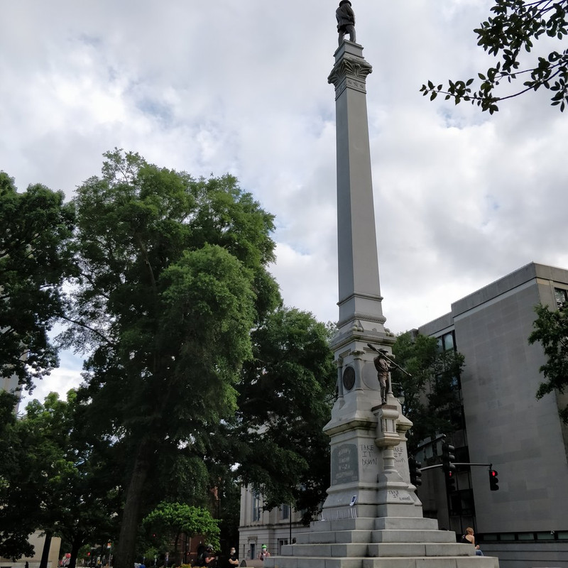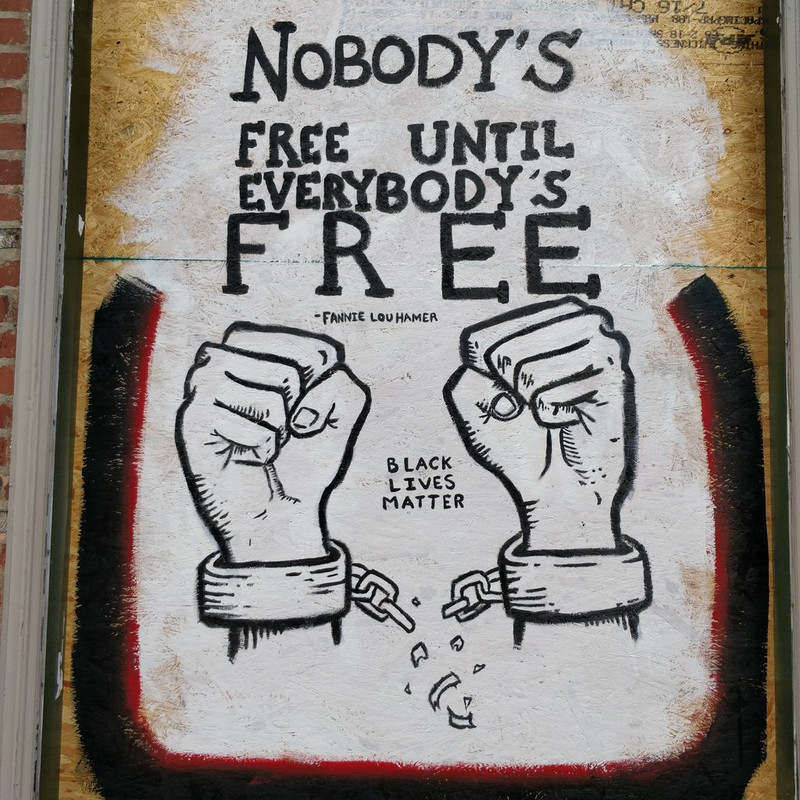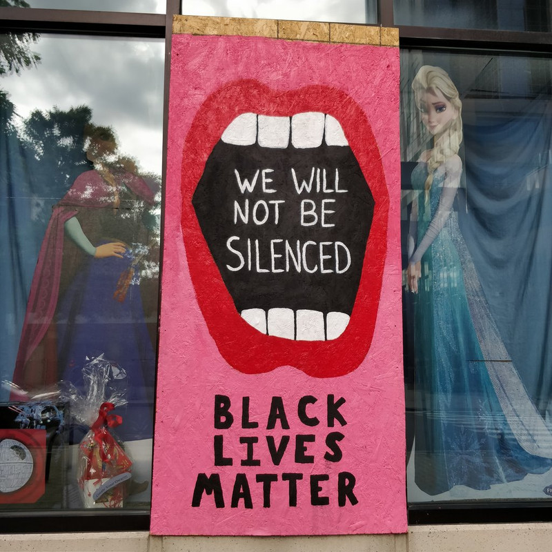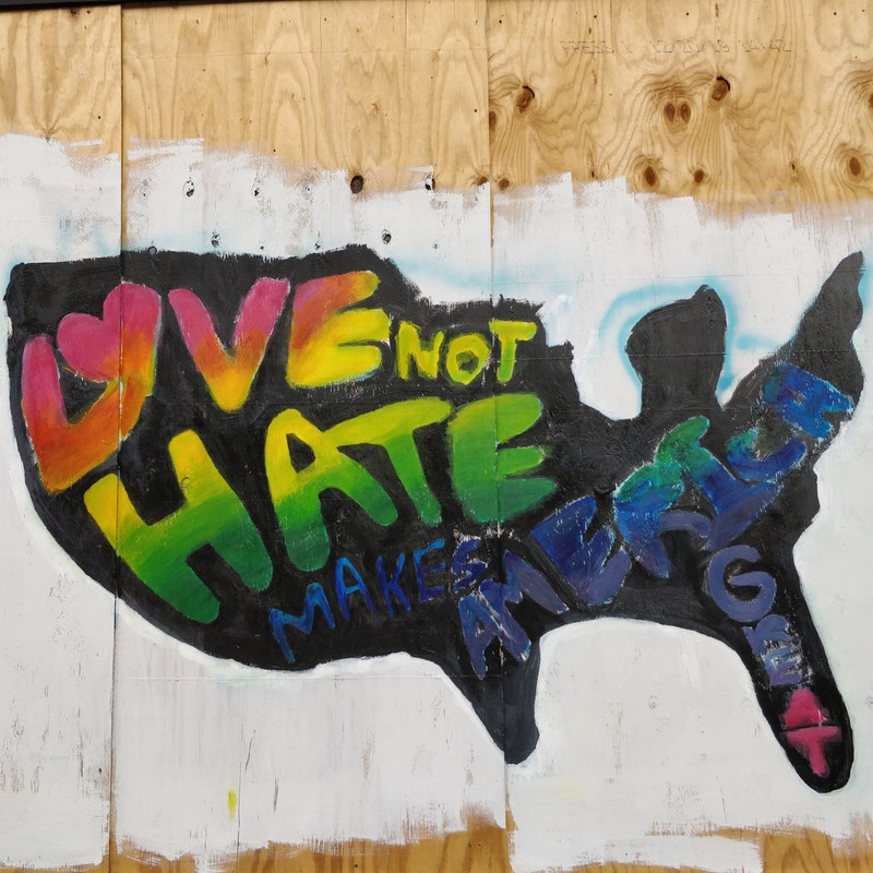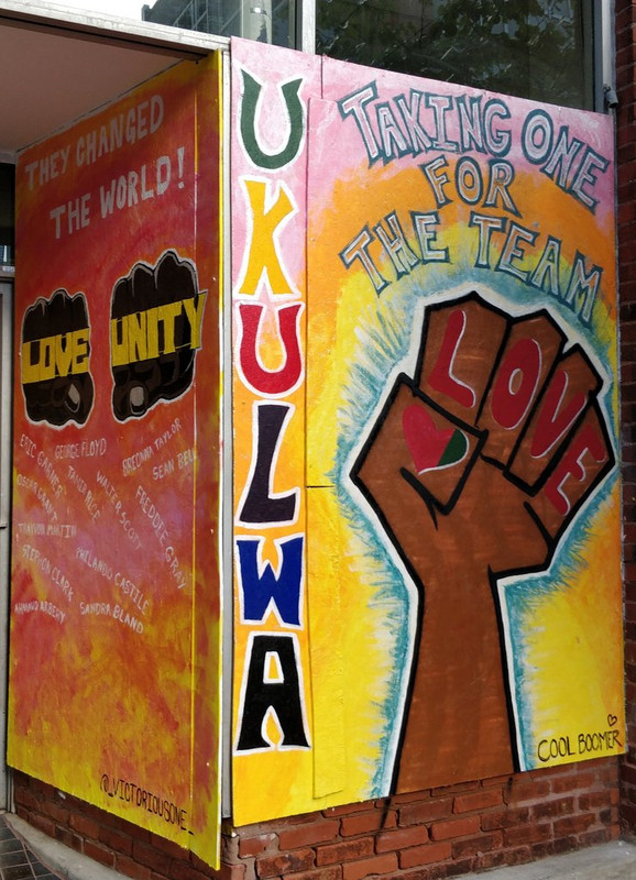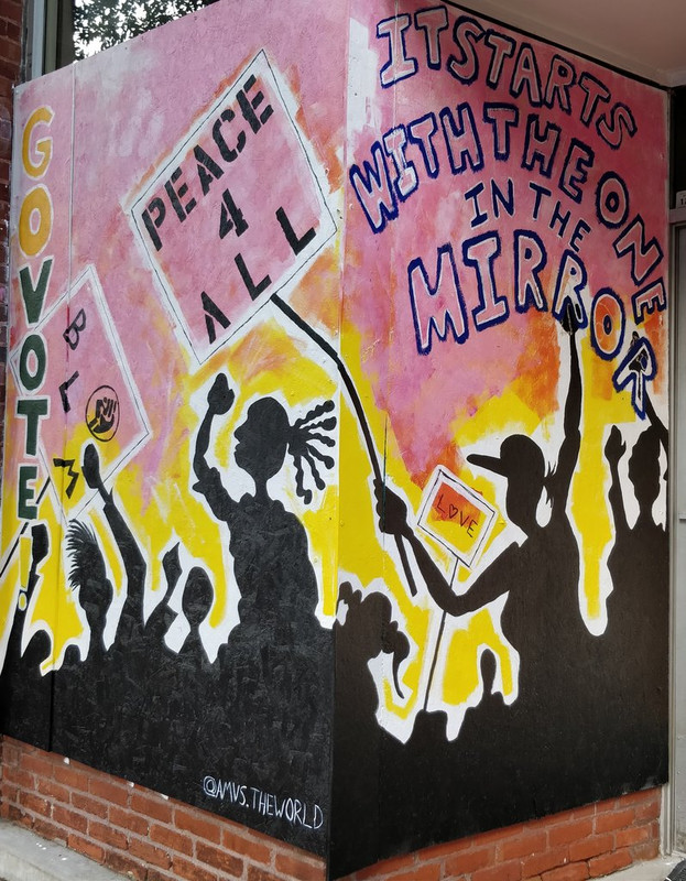We have had protests since the death of George Floyd. The first two nights, the protests turned ugly and many, many windows were smashed. Two stores--a pharmacy and a convenience store--had fires set in them. Plywood went up all over downtown Raleigh to replace broken windows or protect what hadn't been broken. It didn't take long before artists appeared to make use of the blank canvas. The grounds of the Capitol are now surrounded by barricades and guarded by half a dozen State Police. The large statue on the grounds honoring the Confederate dead has been a target and is covered in graffiti.