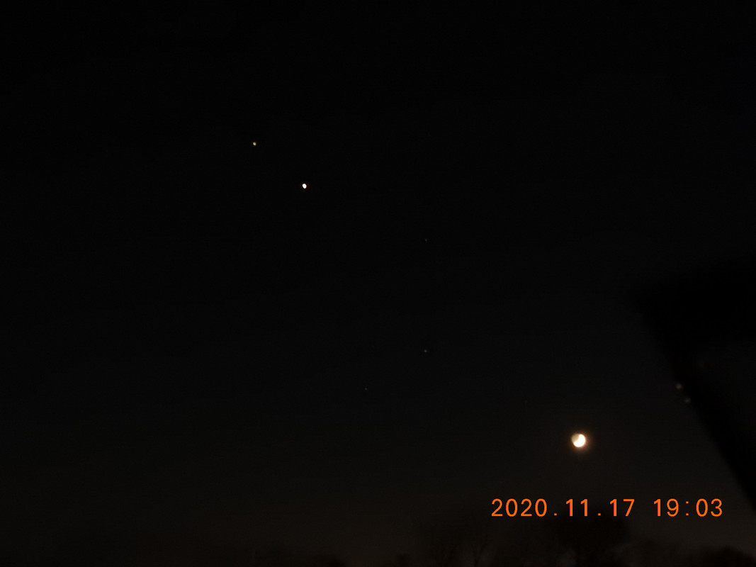 From November 18 to 21, 2020, as darkness falls, use the waxing crescent moon to locate the gas giant planets Jupiter and Saturn, now headed for their once-in-20-years great conjunction on the December 21 solstice. Jupiter is the brighter of these two worlds, outshining Saturn by 12 times. Even so, Saturn is respectably bright, shining as brightly as a 1st-magnitude star. And, of course, in our November 2020 sky, these two worlds Jupiter and Saturn are exceedingly noticeable for their nearness to each other.
