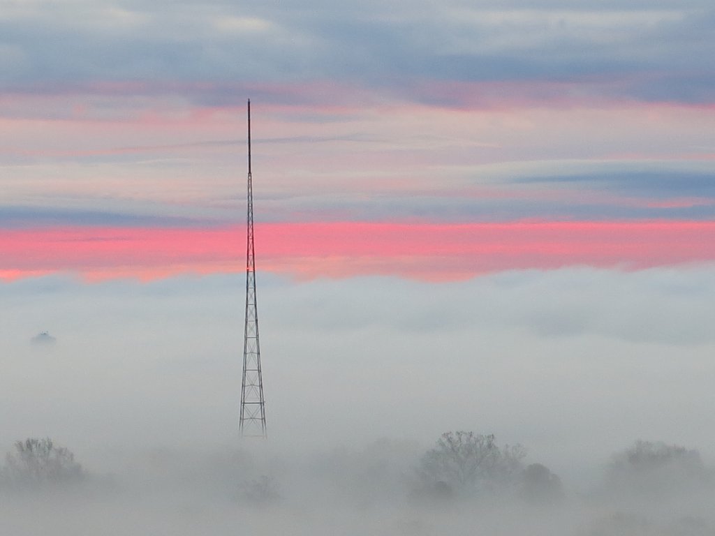 Some amazing pockets of fog this morning. Still leafy tree tops--in January!--just above the fog. And the tower with some streaks of pink, blue, and yellow behind it at dawn. No post processing.