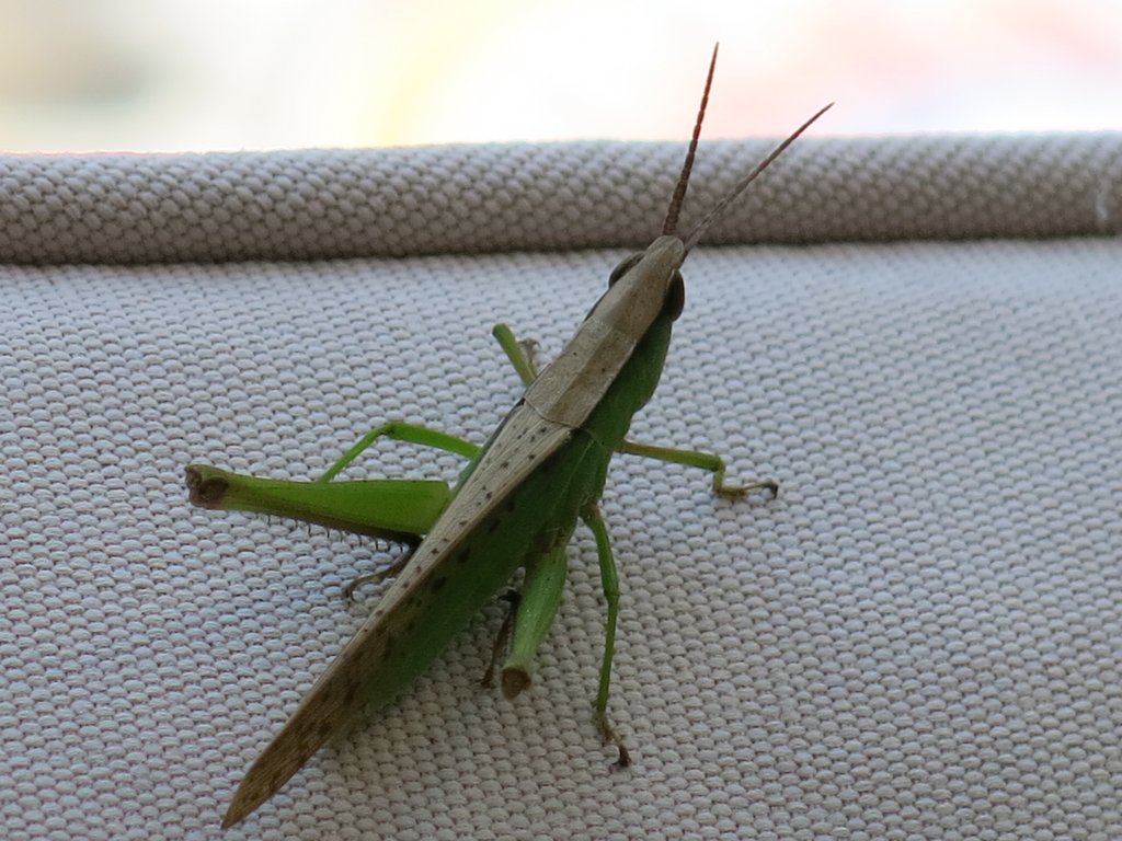 that even this grasshopper is hangin' out in the shade on the lounge chair on my patio.