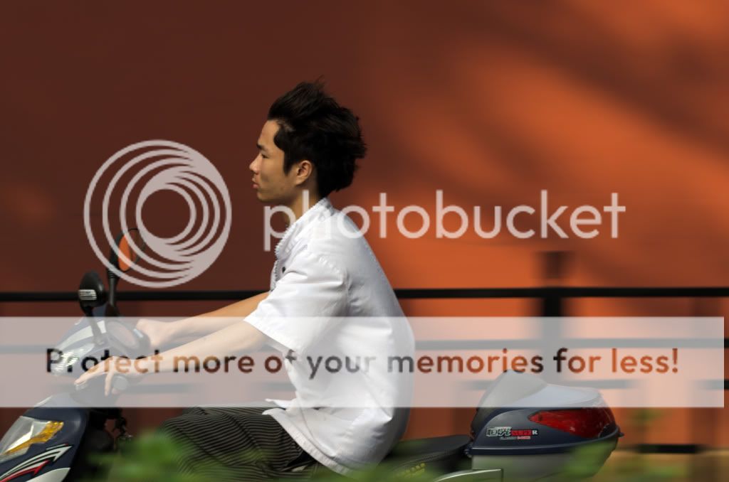 While the concept is simple enough, the execution is not. Focus becomes problematic. As far as autofocus goes, if you don't have a high end SLR that can track fast moving targets, the camera may never allow shutter release to occur, or if it does the subject may be out of focus. You also need a fairly steady hand that can move the camera in a fluid motion along with the subject. If your camera doesn't have a fast autofocus system, all is not lost. If your camera allows manual focusing, you can focus on a spot at the right distance to the point at which you want to release your shutter. As you are panning when you get to that point you release the shutter. If your camera has shutter lag, you may need to press the shutter release before you get there. The shutter speed you use depends on how fast your subject is moving, and how much of the effect you want. In the picture below, my shutter speed was 1/160 which wasn't slow enough to produce a very dramatic effect, but it was fast enough to make the effort relatively easy. The slower shutter speed you use also means you have to be more precise with your technique.