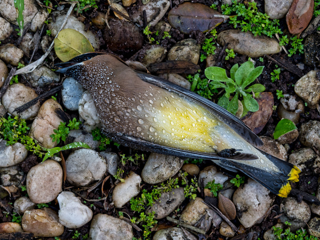 Cedar Waxwing I happed upon this morning. It showed no signs of being attacked by a predator so I am going to assume it had ingested something toxic. I was enthralled by the drops of water and the peaceful repose when I took the shot, all the time wondering what misfortune had befallen upon this beautiful bird.