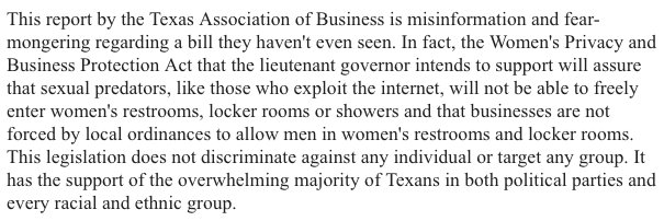 "This report by the Texas Association of Business is misinformation and fear-mongering regarding a bill they haven't even seen," Patrick said in a statement. "In fact, the Women's Privacy and Business Protection Act that the lieutenant governor intends to support will ensure that sexual predators, like those who exploit the internet, will not be able to freely enter women's restrooms, locker rooms or showers and that businesses are not forced by local ordinances to allow men in women's restrooms and locker rooms. This legislation does not discriminate against any individual or target any group."
