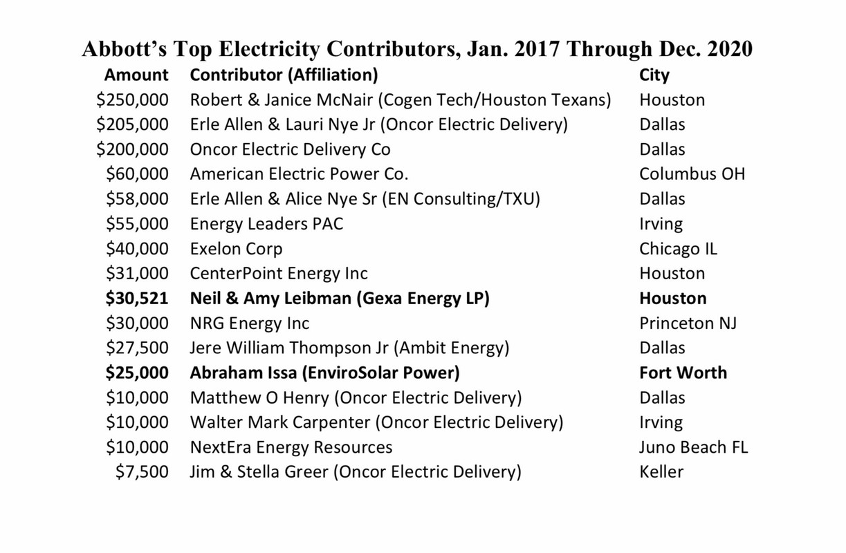 From BETO: "Gov Greg Abbott's Top Donors/ 2017-2020/ Oil, Gas, Electricity