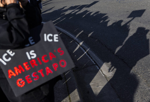 The Signs of Fascism protest was organized by South Snohomish County Indivisible. Holding signs such as Freeze ICE and Defend democracy, attendees waved at cars getting on and off the Edmonds-Kingston ferry.