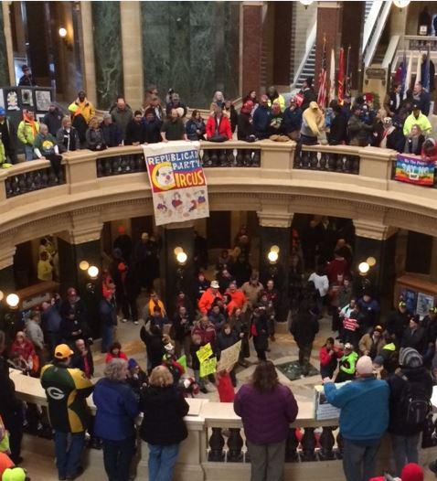 anti-RTW protesters gather in the rotunda of the #Wisconsin State Capitol. #wirtw #wiright #wiunion