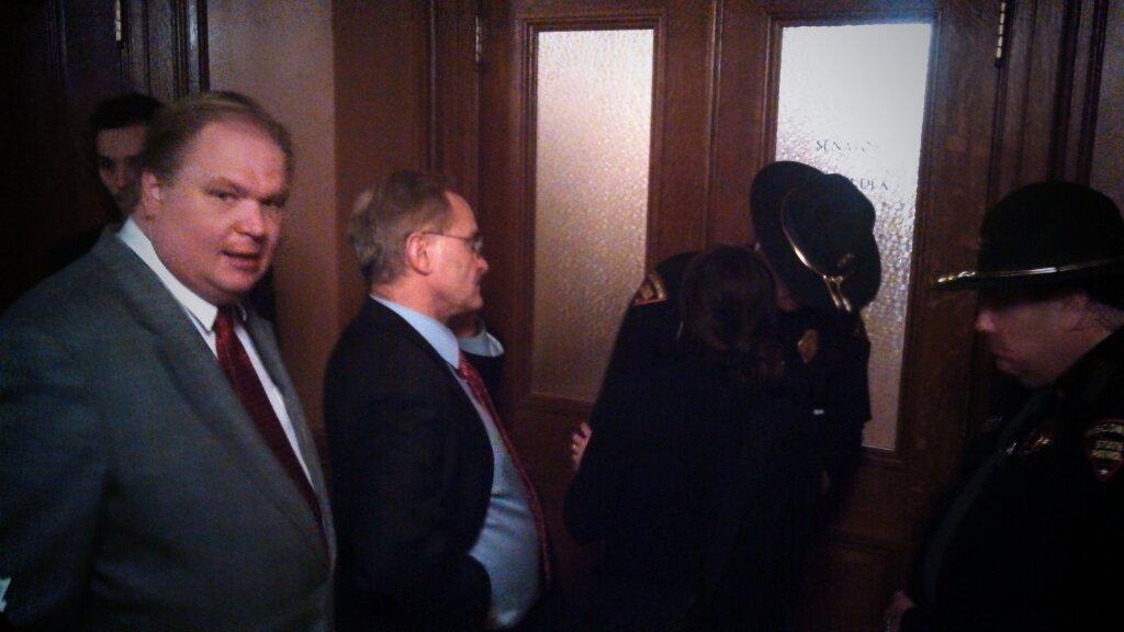 Sen. Chris Larson, D-Milwaukee, called for debate, but the clerk called the roll of the five members, and three Republicans apparently voted in favor with no discussion. After the meeting ended, Sen. Bob Wirch. R-Kenosha, read the newspaper story, which said that the two groups planned a peaceful protest to disrupt the committee hearing.